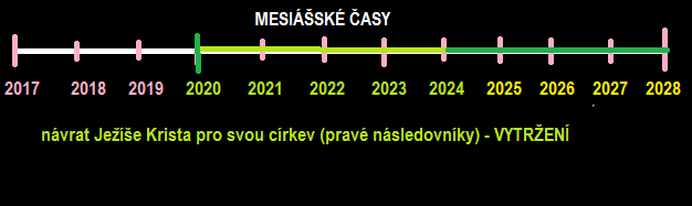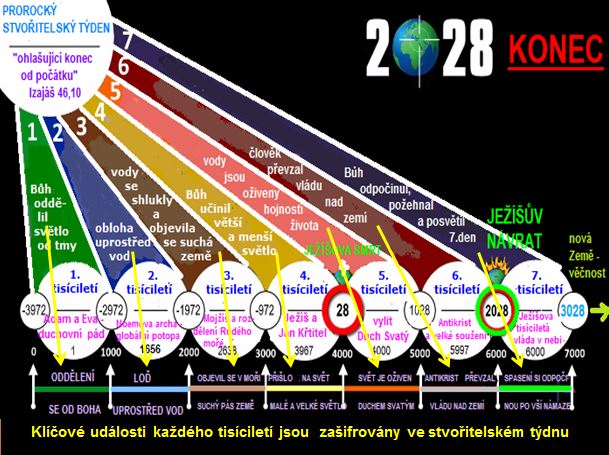Bůh dal tomuto druhému světu 6 tisíc let a po uplynutí 4 tisíc let dal jeho syn Ježíš Kristus při svém prvním pobytu na Zemi, vtělený do člověka, přidal další, detailnější proroctví, podobenství a znamení, která všechna (o fíkovníku a poslední generaci, o milosrdném Samaritánu vyúsťují plus mínus do konce 20.let 21.století, kdy se kolem roku 2028, plus mínus cca rok, naplní jednak 2000 let od smrti a vzkříšení Ježíše Krista a také 6000 let dějin lidstva, čas, který Bůh vymezil pro vládu zla na Zemi, a také v tomto roce 2028 končí 80 let, tedy maximum věku určené v Bibli pro jednu generaci, branou jako celek. Vše se sbíhá k jednomu časovému bodu a podle proroctví daných Židům (není ve Starém Zákoně je totiž z doby křesťanské, dané Ben Samuelovi) již od roku 2017 nastává mesiášské období, období očekávání Spasitele. Viz obrázek umístěný o kousek níže - přeložený ze stránek www.2028end.com - proroctví ukryté v příběhu tvoření.