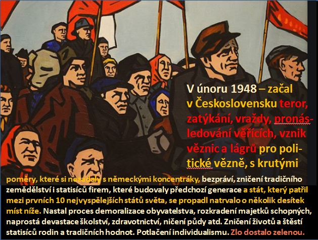 A jakmile se pomocí Stalinových vojsk a jeho tajné služby NKVD uchopili komunisté moci v Československu a dalších východních zemích, začalo i tam vládnout bezpráví, zločiny, mučení, popravy a krutá vězení se stali každodenní skutečností pro mnohé. Stejně jako násilná kolektivizace. Odstraňování všech slušných svobodně smýšlejících lidí z jejich míst a někdy i ze života, jako například ministra zahraničí Jana Masaryka, kterého vyhodili z okna Pražského hradu na beton a prohlásili, že to byla sebevražda. A málokdo ze skutečné morální elity národa unikl vězení, které mnozí nepřežili nebo se z něho vrátili jako doživotní mrzáci.