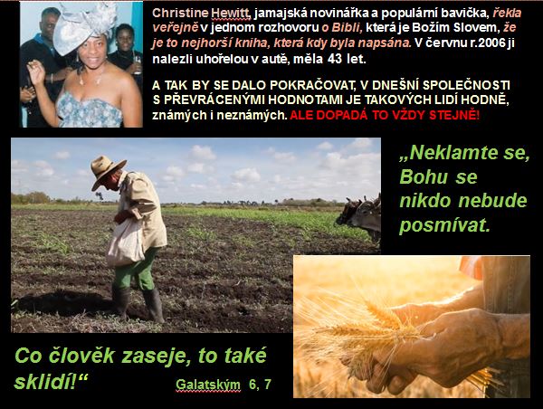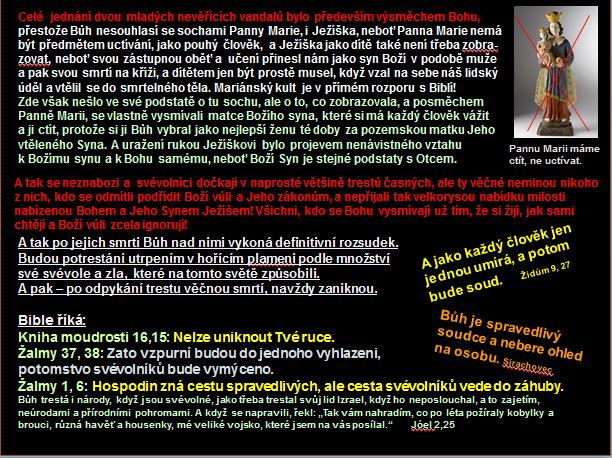 A tak paní Alenu napadlo, že bude nejlépe, když tu "mizérii" skončí. Ona stejně jako ani ostatní ateisté nevěděla, že hříchy jsou jako supermarket se zbožím s odloženou platbou. Konzumuje a užívá se hned, platí až později. A nyní začal čas platby. A místo pokání, obrácení se k Bohu a radikálního otočení kormidla svého života do správného směru, ji stejně jako mnoho dalších podobných třtin napadlo takové fatální a dekadentní řešení, vzít si nějaké prášky, nejlépe celou tubu naráz a zapít je alkoholem, pak nastane v bezvědomí kolaps organismu a nastoupí smrt a s ní se dostaví pokoj od denodenních starostí i trápení. ně