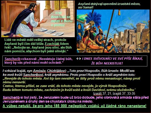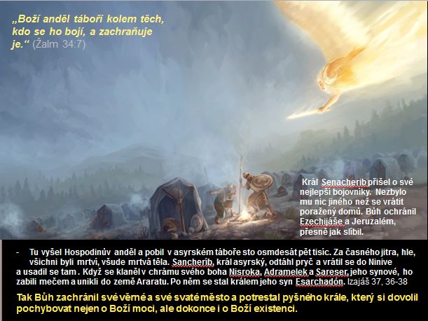 Po smrti zbožného krále Ezechiáše ale pak už jen s jednou malou zastávkou morálka a zbožnost celého Judska šla z kopce, nastoupili na trůn Boha neposlušní nebo dokonce i mravně zkažení králové a lid po vzoru svých vládců uctíval jiné bohy, pěstoval čarodějnictví, porušoval Boží přikázání a nařízení, takže když cca o 150 let později přitáhla k Jeruzalému opět cizí veliká dobyvatelská armáda, tentokrát pro změnu další veliké světové říše, a to Babylónské, tak Bůh už pro jejich hříchy Jeruzalém nezachránil a ten padl, byl vydrancován, unikátní Šalamounův chrám shořel a Židé byli jako národ, vyjma největších chudáků, odvlečeni do Babylónu a jeho okolí. Ale to už je jiná historie. Snad jen by bylo dobré připomenout, že nejen pro celé národy, ale zejména i pro jednotlivé lidi platí, že "Bůh hříšníků neslyší, ale ty, kteří plní Jeho vůli, slyší", jak to nechal Bůh zapsat ve své knize - Bibli.