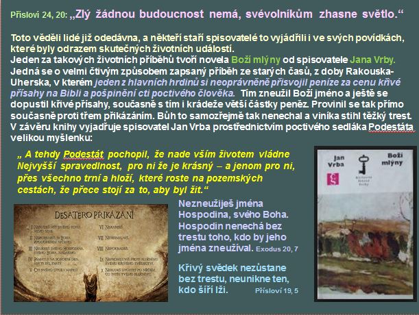 Proto, závěrem uveďme trojici citátů z Písma, která vyjadřuje různými slovy to samé, jak si máme počínat na trnité cestě životem. samozřejmě zlu je nutno vzdorovat, jak jen je možné, pokud to má smysl, protože jak již řekl velký křesťanský myslitel Erich Kästner:"Na každím zlu mají podíl nejenom ti, co ho páchají, nýbrž i ti, co mu nebrání." Ale současně se netrápit a doufat v pomoc Boží. Bible říká: